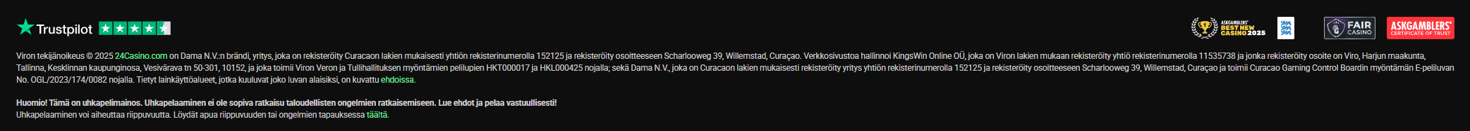 Lisenssipuolella 24 Casino pelaa turvallisilla korteilla, sillä se toimii Viron EMTA-lisenssillä. Kasino täyttää EU:n tiukat sääntelyvaatimukset ja tarjoaa verovapaat voitot suomalaisille pelaajille.
