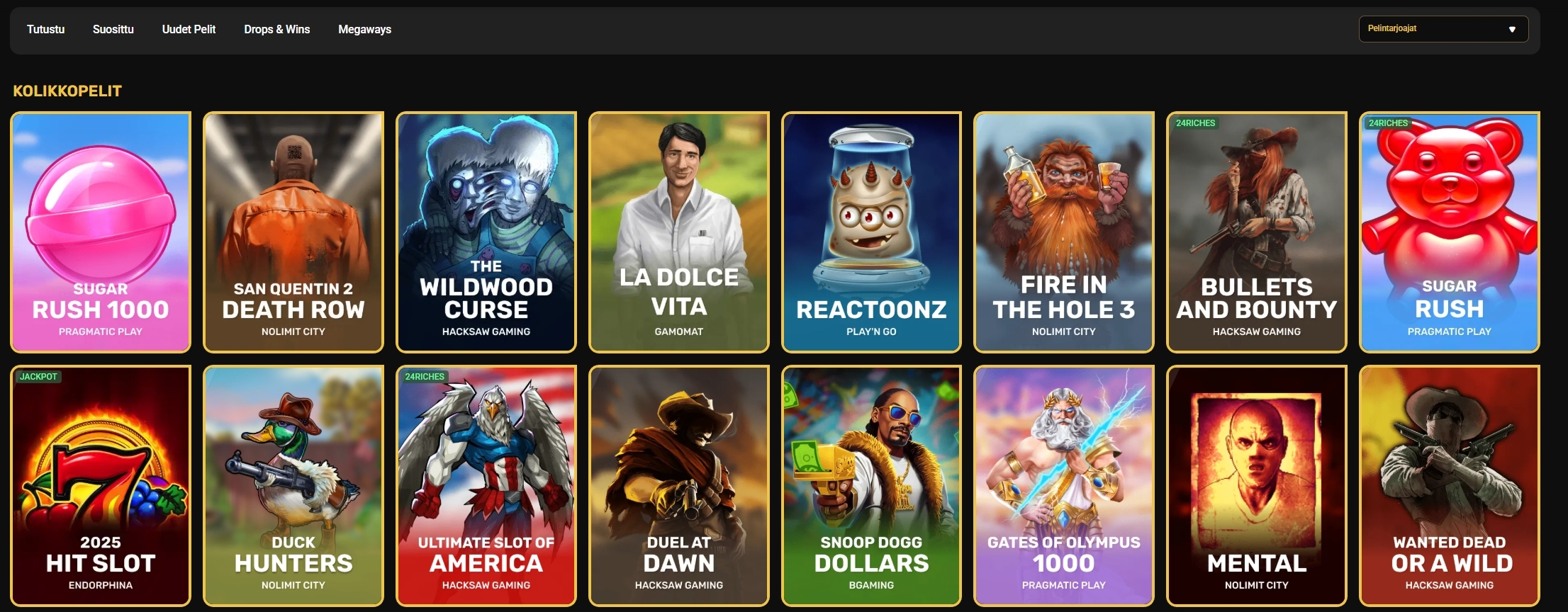 Mukana ovat alan kovimmat nimet, kuten Pragmatic Play, Play’n GO, Playtech, Quickspin, Spribe, Nolimit City, Relax Gaming, NetEnt ja Hacksaw Gaming. Eli jos et löydä täältä suosikkiasi, sitä ei todennäköisesti ole vielä julkaistu!