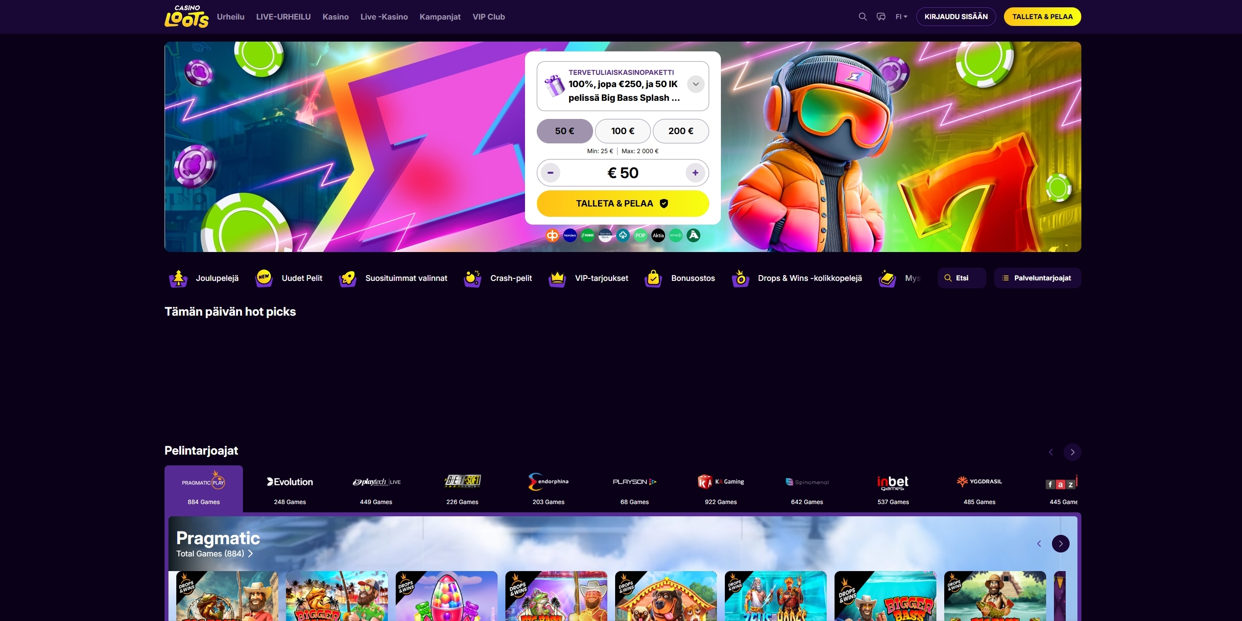 Heti etusivulla on erilaisia kategorioita nostettuna hienosti esiin. Sieltä löytyy ensimmäisenä Joulupelit (luonnollisesti näin joulun alla), Uudet pelit, Suosituimmat valinnat, Crash-pelit, Bonusostot ja niin edelleen… Tästä osiosta ei voi moitteita antaa, sillä selkeä jaottelu kyllä helpottaa pelien selaamista.