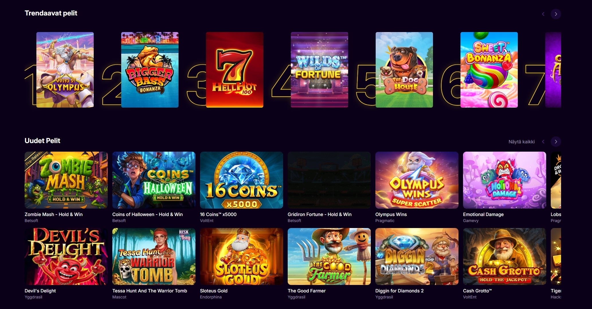 Uutuuksia tullaan varmasti lisäämään tulevina viikkoina aktiivisesti, mutta uusimpien listalta löytyy jo nyt esimeriksi Devil's Delight, Sloteus Gold, Le Zeus, The Good Farmer, Zombie Mash Hold & Win sekä Power Pack.