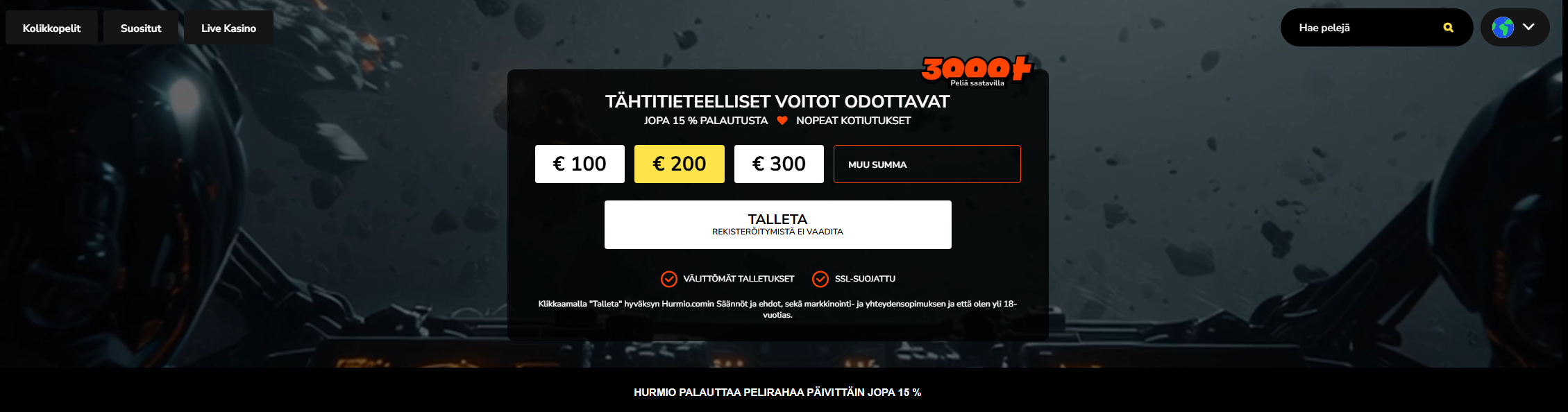 Hurmio Casino, suuntaa kuuhun! No niin lukee ainakin etusivulla, kun avaat tämän loppuvuoden 2025 uutuuden! Hurmio Kasino pistää vauhtia pelaamiseen heti alusta alkaen, sillä mukaan pääsee jo 1 eurolla. Hurmio ei ehdi myöskään hyytymään missään vaiheessa, koska pelaaminen käynnistyy omilla verkkopankkitunnuksilla parilla klikkauksella. Perinteistä tervetuliaisbonusta ei ole tarjolla, mutta tästä ei tarvitse huolestua: tarjolla on nimittäin 15% päivittäinen käteispalautus, oli pelipäiväsi sitten voittoisa tai tappiollinen!