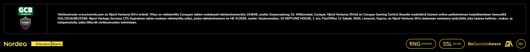 Hurmio Kasino ei ole verovapaa, koska sen taustalla toimii Curaçaolle rekisteröity Njord Ventures BV. Kasino operoi Curacao Gaming Control Board lisenssillä OGL/2024/481/0169.
