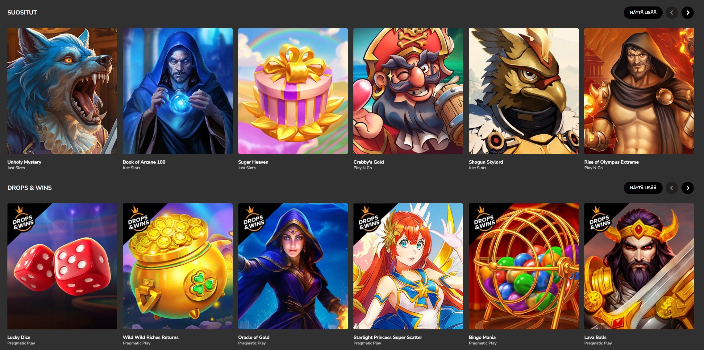 Live-puoli on myös yhtä vahva. Evolution Gaming ja Pragmatic Play Live pitävät pöydät vauhdissa, ja tunnelma on hyvin lähellä oikean kasinon kokemusta. Tarjolla on baccaratin ja blackjackin kaltaisia klassikoita, mutta myös show-pelejä ja muita viihdyttäviä vaihtoehtoja.