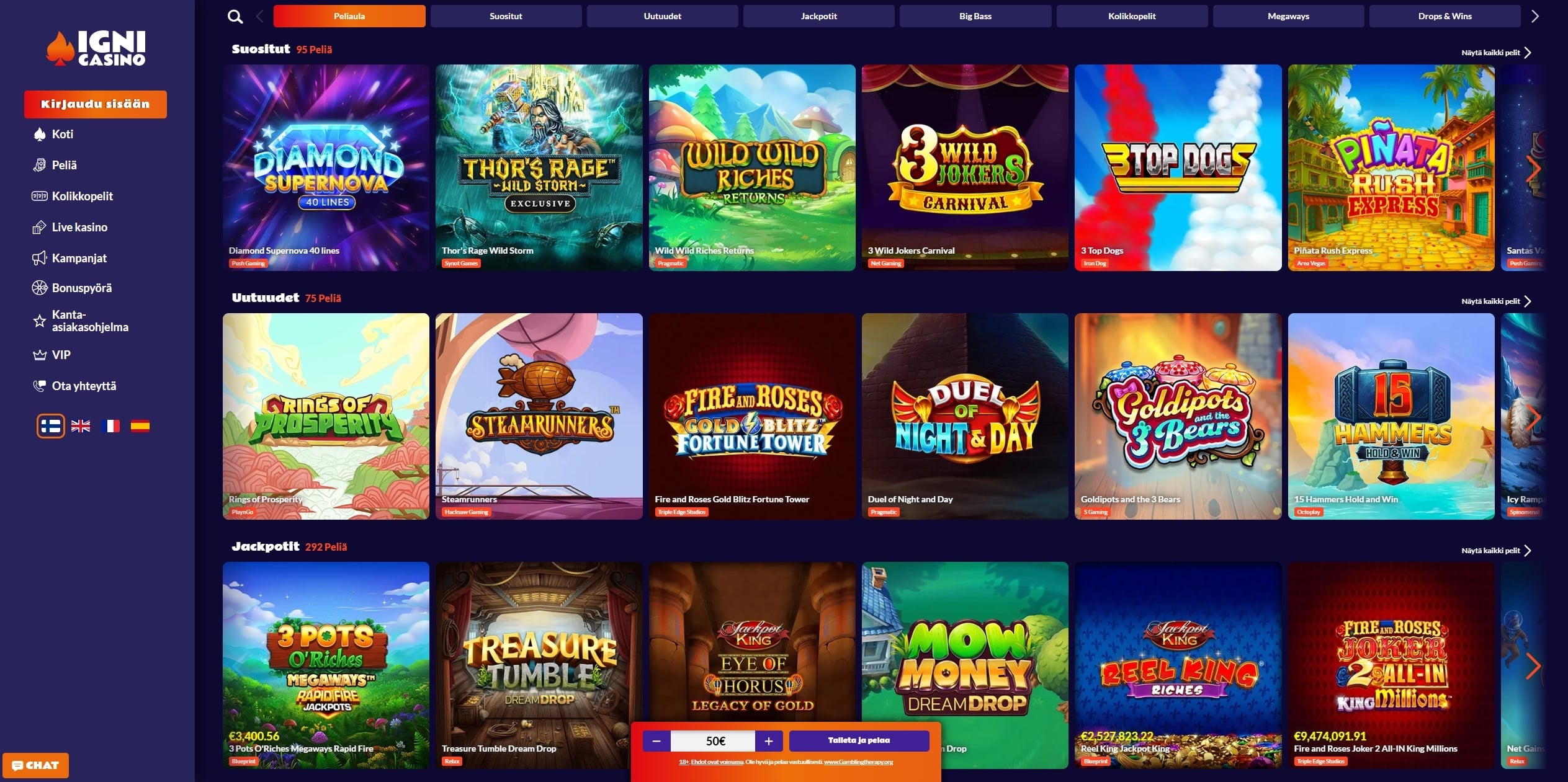 Igni Casino on moderni ja hyvin toteutettu pikakasino, jossa kaikki toimii Trustlyn avulla: talletukset ovat välittömiä ja tunnistautuminen hoituu yhtä helposti kuin verkkopankissa asiointi. Taustalta löytyy arvostettu White Hat Gaming ja kasinolla on MGA lisenssi, mikä tekee kokonaisuudesta sekä turvallisen että verovapaan suomalaisille. Slottikuninkaan kautta saat uniikin 150% talletusbonuksen ja ilmaiskierroksia. Toki aktiivisille pelaajille löytyy myös VIP ohjelma lisäetujen kera. Peliaulassa on tarjolla lähes 5000 peliä, eli tekemistä riittää. Kaikki keskeiset osa alueet on toteutettu huolella ja Igni Casino tarjoaa alusta asti luotettavan pelikokemuksen.