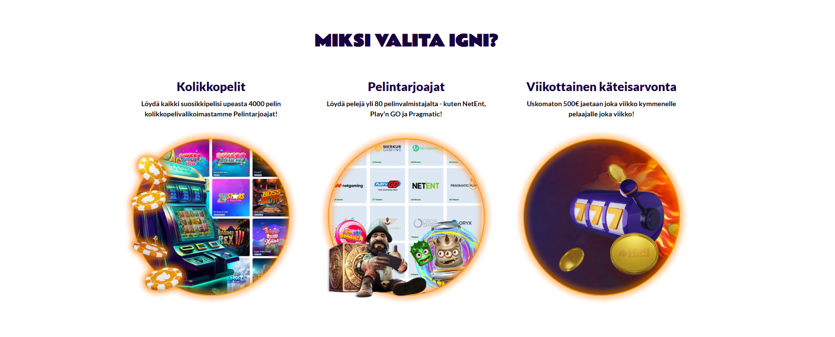 Turvallinen ja verovapaa Igni Casino on moderni, selkeä ja erittäin hyvin palveleva pikakasino, joka jätti meihin kokonaisuutena vahvan vaikutuksen. Pelivalikoima on näyttävä: yli 120 brändin tarjoamat tuhannet pelit takaavat, että tekeminen ei lopu kesken. Ja kun mukaan lisää meidän kautta saatavan tavallista tuhdimman tervetuliaisbonuksen, alku lähtee käyntiin vähintäänkin mukavalla vauhdilla!