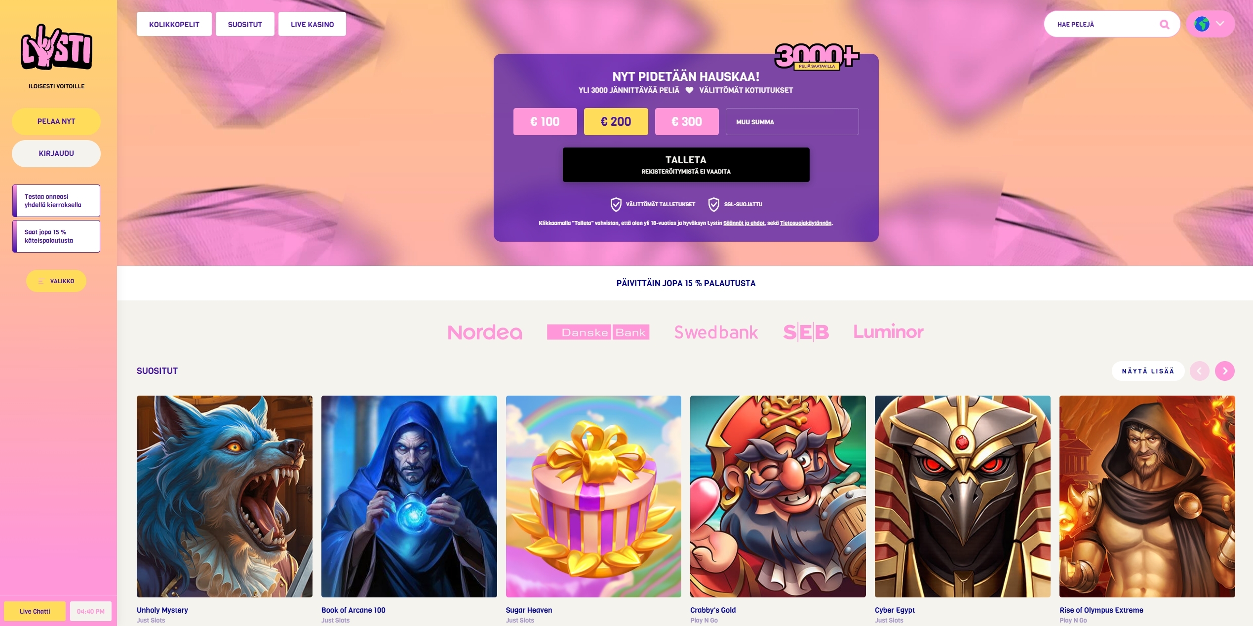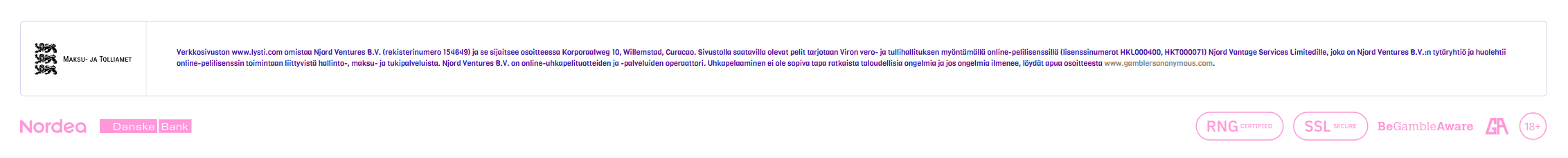 Lysti Casino tarjoaa turvallisen ja verovapaan pelipaikan Viron lisenssin alla. Se kuuluu Njord Venturesin suosittuun kasinoperheeseen ja toimii kätevästi pankkitunnuksilla ilman rekisteröintiä. Kotiutukset siirtyvät pankkitilille muutamassa minuutissa. Uusille pelaajille ei ole tarjolla erillistä tervetuliaisbonusta, mutta jokainen pelaaja saa päivittäin 15% käteispalautuksen edellisen päivän tappioista. Se on selvästi yksi markkinoiden anteliaimmista peruseduista! Pelivalikoimasta löytyy useita tuhansia vaihtoehtoja kuten kolikkopelejä, jackpoteja, pöytäpelejä, livekasinon puoli ja Megaways pelejä. Lysti sopii kotimaiselle pelaajalle joka arvostaa helppoutta, nopeita nostoja ja mutkatonta pelifiilistä!