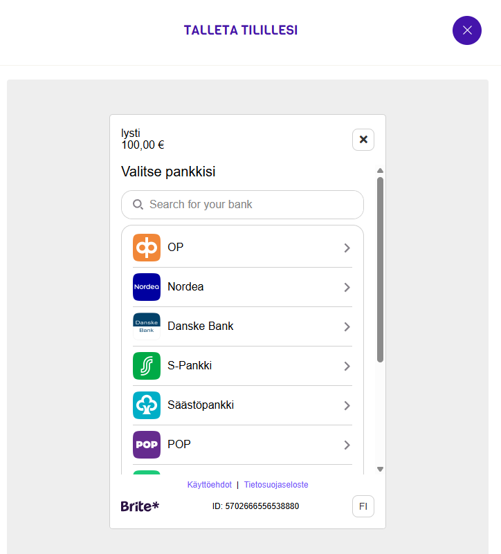 Briten käyttäminen on helppoa ja onnistuu kaikkien suomalaisten pankkien verkkopankkitunnuksilla. Minimitalletus on vain yhden euron!