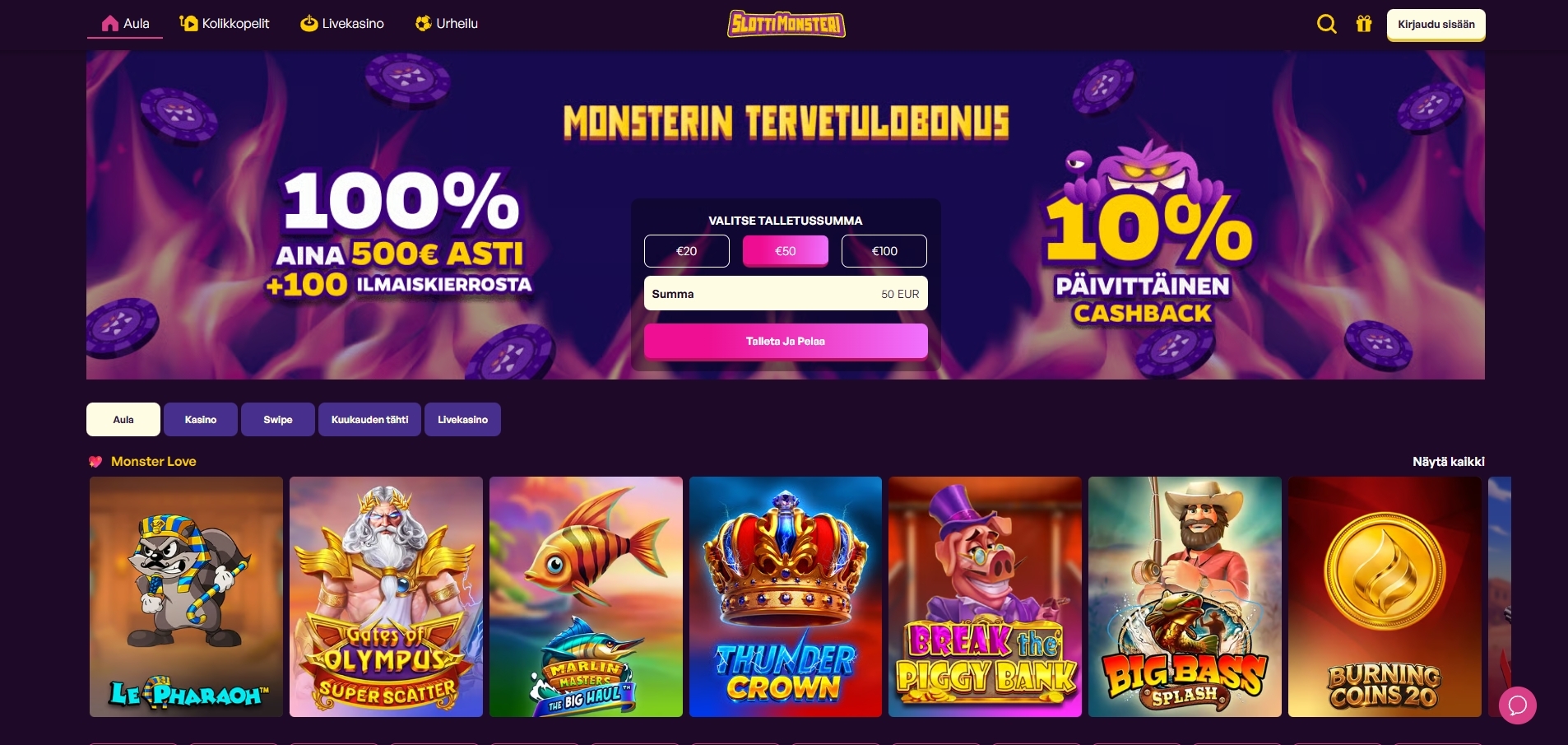 Slotti Monsteri Casino toivottaa uudet pelaajat tervetulleiksi varsin anteliaalla paketilla, jossa yhdistyvät bonusraha ja ilmaiskierrokset. Ensitalletuksella on luvassa 100% bonus aina 500 euroon asti sekä 100 ilmaiskierrosta kaupan päälle.