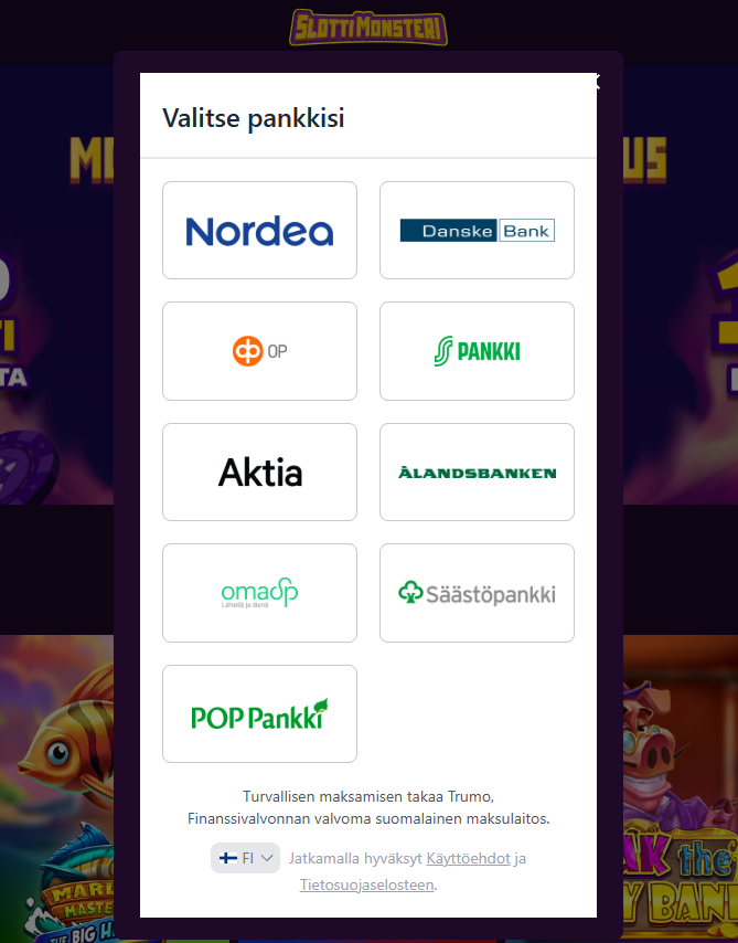 SlottiMonsteri kokemuksia kertyy heti, kun siirryt kasinolle tämän arvostelun linkistä ja teet pikatalletuksen Trumo-maksutavalla. Talletus ja tunnistautuminen tapahtuvat verkkopankkitunnuksilla, joten pääset pelaamaan välittömästi ilman rekisteröitymistä.
