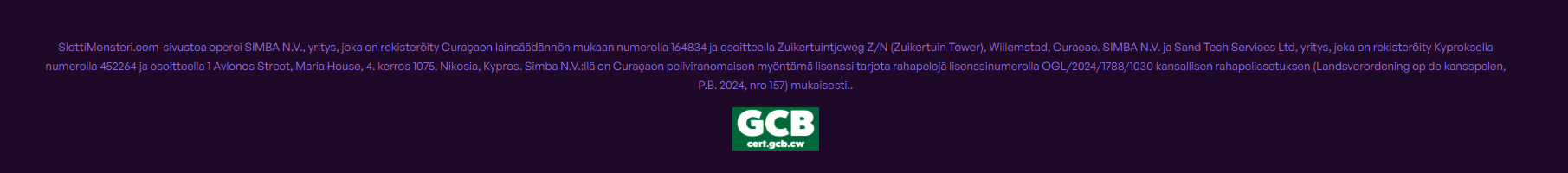 SlottiMonsteri on Curacaon peliviranomaisen valvoma ja täyttää kaikki turvallisen kasinotoiminnan perusvaatimukset. Sivuston taustalla toimii Simba N.V., joka on Curacaolle rekisteröity yhtiö ja saanut toimilupansa Curacao Gaming Control Boardilta (GCB).