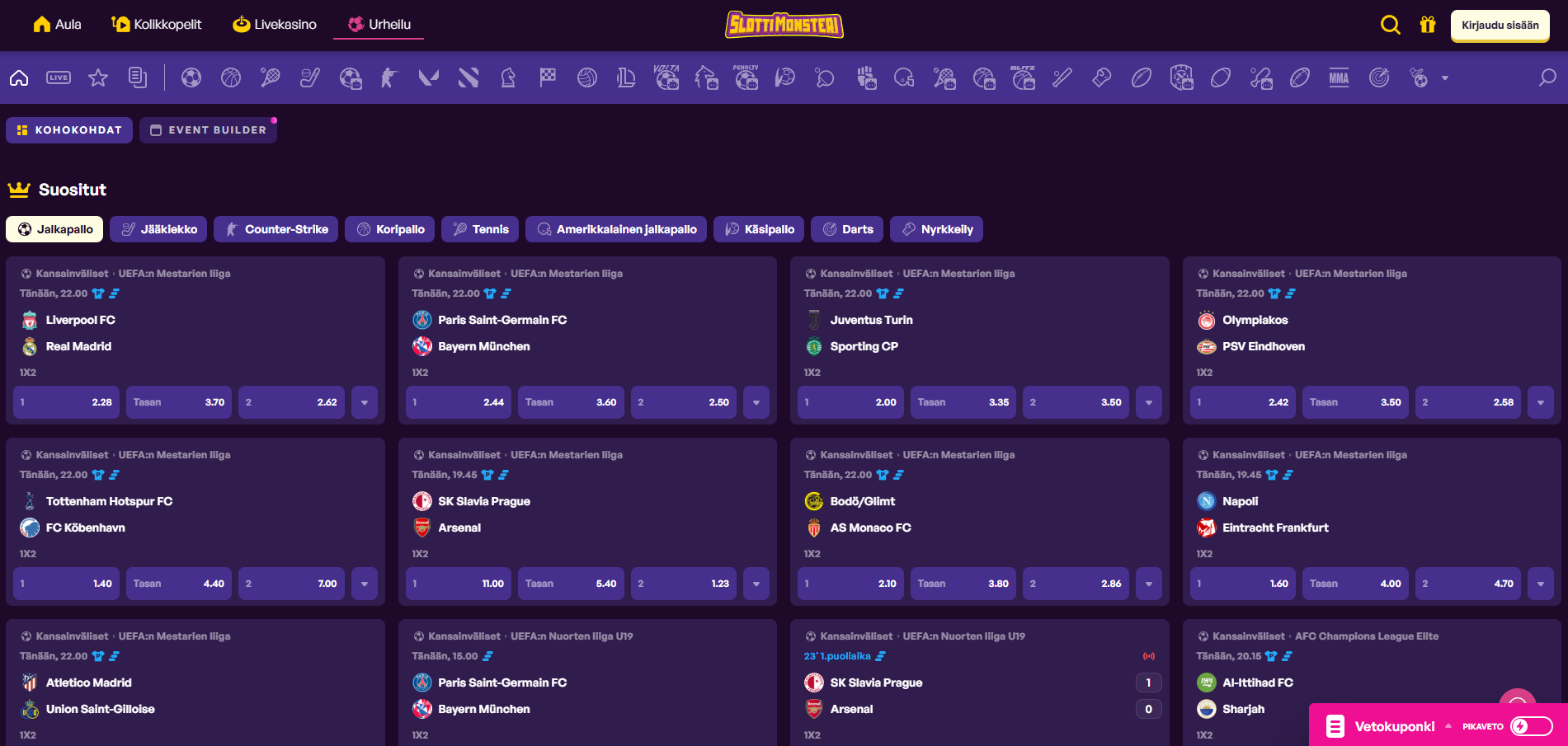 Testitiimimme mielestä kyllä. SlottiMonsteri on monipuolinen ja toimiva kasino, joka yhdistää kasinopelit ja vedonlyönnin saman katon alle. Taustalla on luotettava tiimi, turvalliset maksutavat ja hyvä bonus uusille pelaajille. Ainoa selkeä miinus on verollisuus, mutta muuten SlottiMonsteri tarjoaa modernin, sujuvan ja viihdyttävän pelikokemuksen.