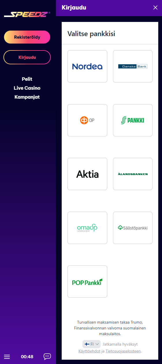 Speedz on täysiverinen Trumo kasino, eli kaikki rahansiirrot hoidetaan suoraan verkkopankin kautta. Muita maksutapoja ei ole tarjolla mutta pikakasinoilta ei niitä yleensä odotetakaan. Talletus onnistuu tällä hetkellä yhdeksän suomalaisen pankin kautta, joten lähes kaikilla pelaajilla on yhteensopiva vaihtoehto heti valmiina.