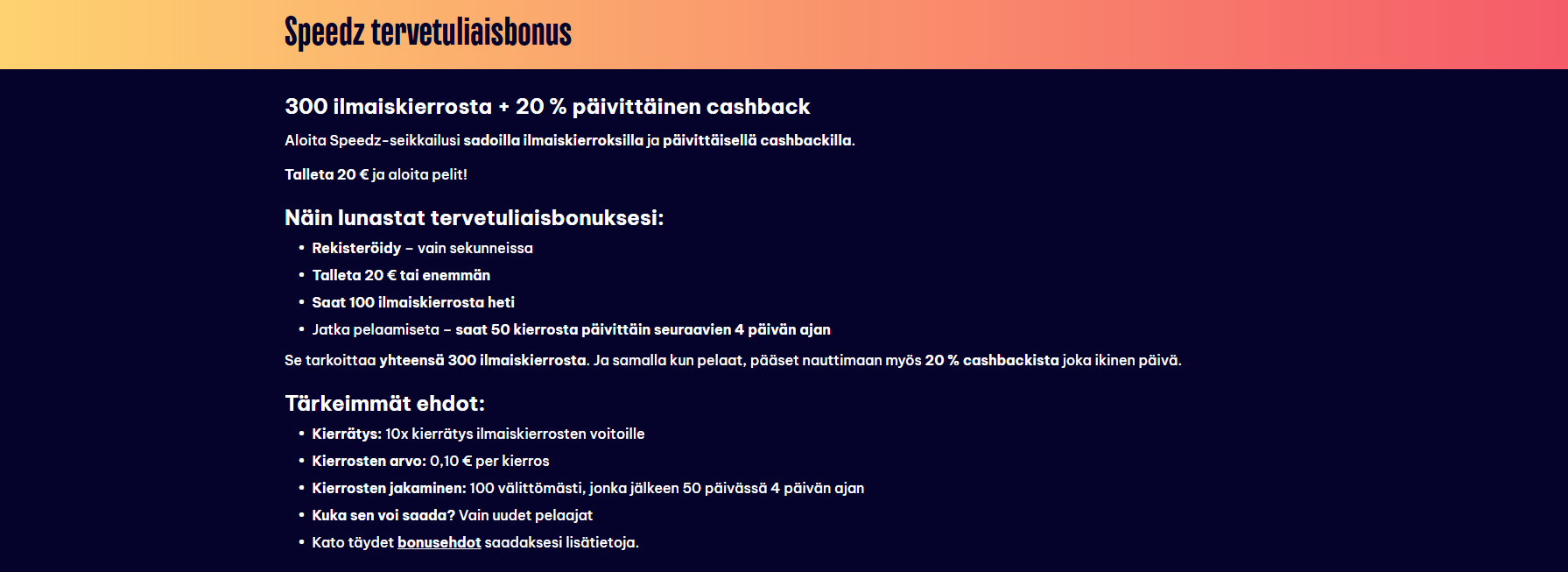 Speedz hemmottelee uusia pelaajiaan varsin anteliaalla startilla: tarjolla on jopa 300 ilmaiskierrosta, ja vain 10x kierrätyksellä. Bonus aktivoituu 20 euron minimitalletuksella, joten mukaan pääsee suhteellisen pienellä panostuksella.