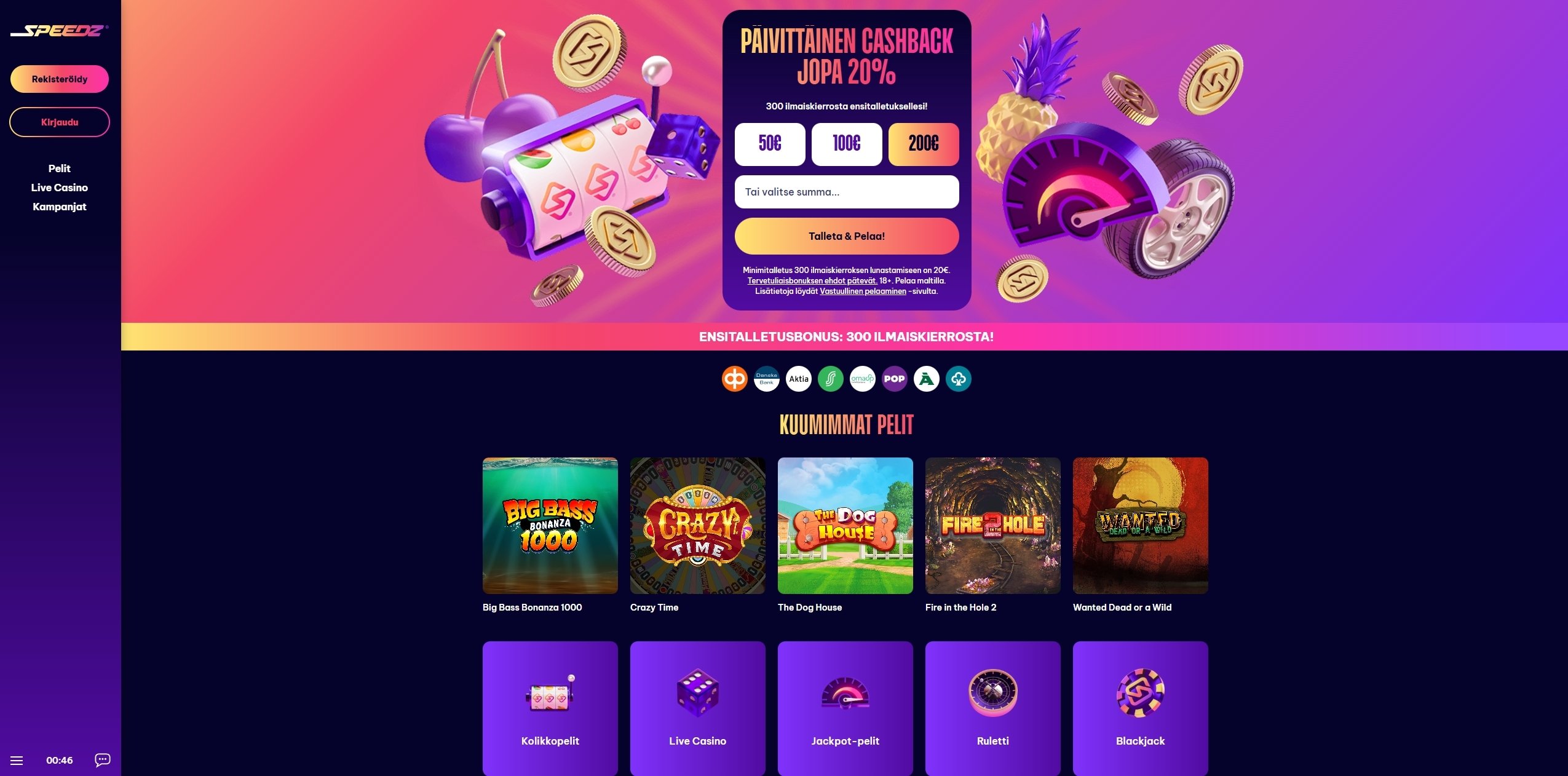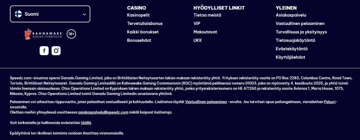Speedz Casino on syksyn 2025 puhutuin uutuus, ja sen taustalla häärää vauhdilla mainetta keräävä Ganadu Gaming Limited. Kyseessä on Trumo pikakasino, jossa yhdistyvät nopeus, laatu ja runsas pelivalikoima. Tarjolla on yli 4000 kasinopeliä, suomalainen live-chat sekä iso kasa ilmaiskierroksia. Vaikka Speedz.com ei tarjoa verovapaita voittoja, se paikkaa tilanteen salamannopeilla kotiutuksilla: testiemme mukaan rahat siirtyivät tilille alle 30 minuutissa. Kuulostaa hyvältä, eikö? Kokeile!