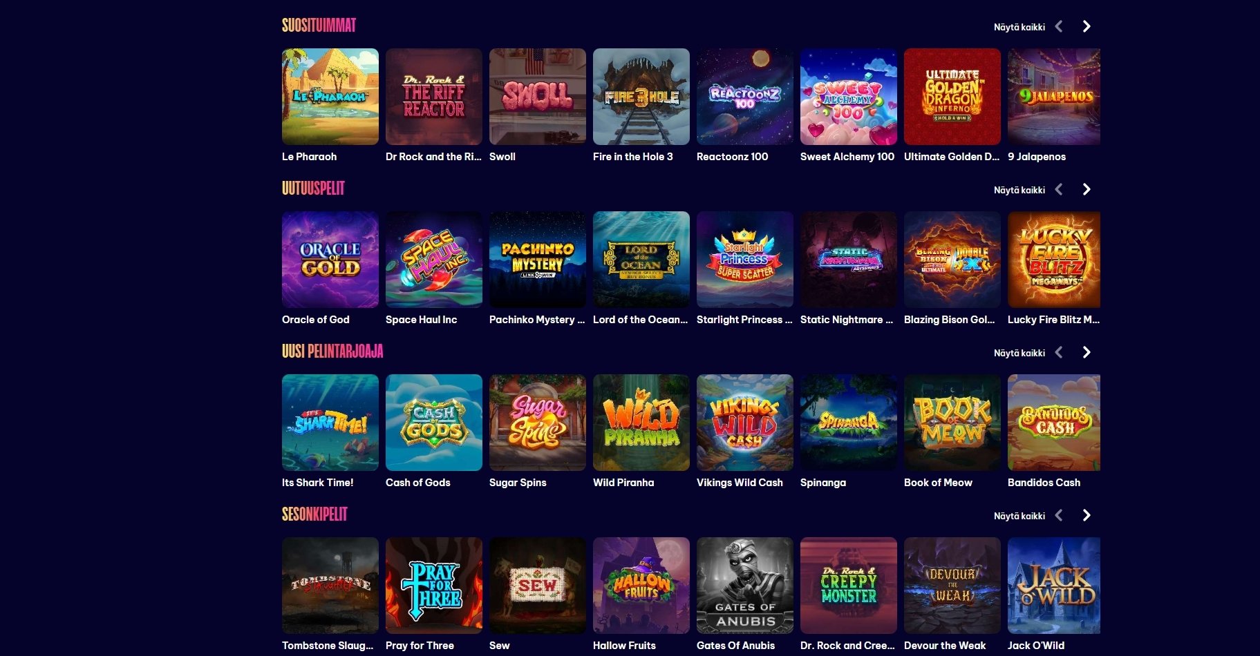Kategorisointi on toteutettu hyvin suomalaispelaajia ajatellen. “Kuumimmat pelit” -osio on erinomainen esimerkki siitä: sieltä löytyvät kaikki kotimaisten pelaajien suosikit, aina legendaarisesta Reactoonzista lähtien! Muitakin helpottavia kategorisointeja löytyy, kuten Sesonkipelit, Novomaticin klassikot sekä Bonusosto.