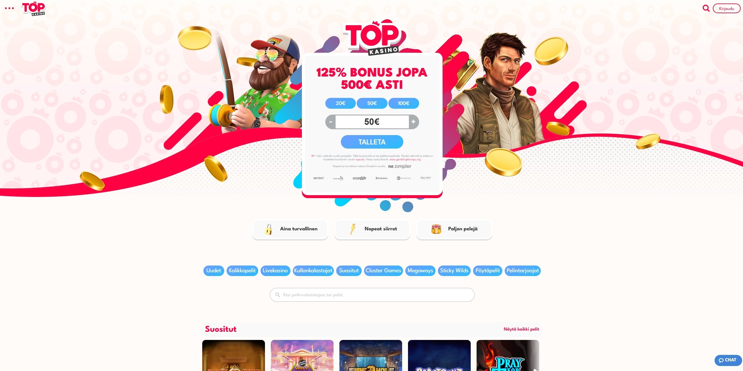 TOPkasinolla on myös yksi iso etu verrattuna moneen muuhun pikakasinoon: tervetuliaisbonus, joka on normaalia isompi 125% aina 500 euroon asti. Muita bonuksia on tarjolla toistaiseksi vain uskollisuusohjelman kautta, mutta tämä yksi iso tarjous on selvästi casinon valttikortti.