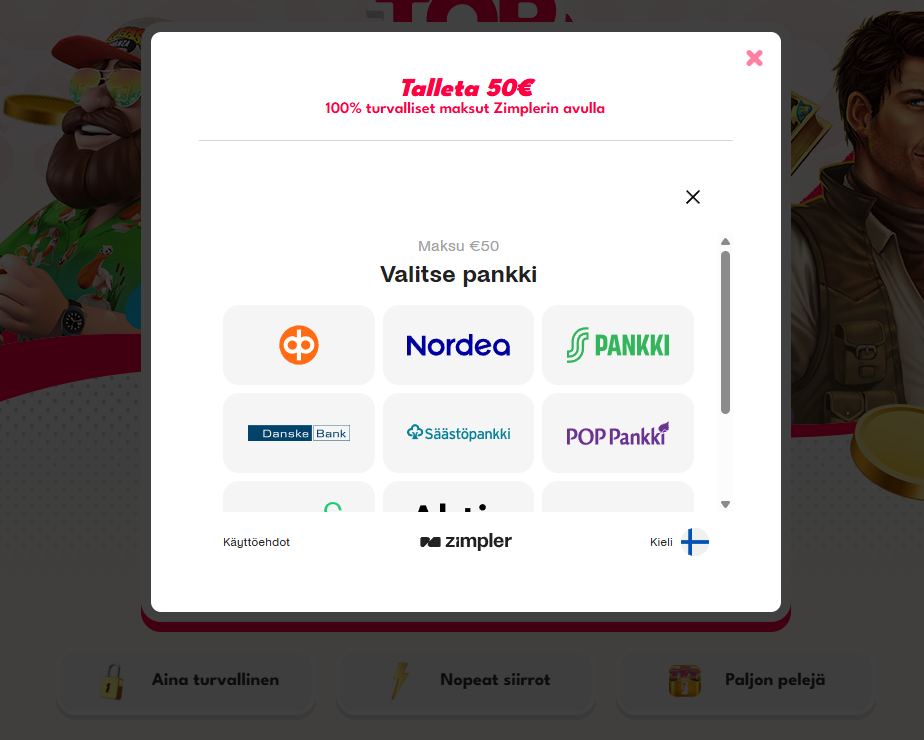 Selkeä design ja järkevästi ryhmitelty pelivalikoima tekevät pelaamisesta sujuvaa, ja pelitilin saa auki vaivattomasti pankkitunnuksilla. Tästä ei pay n play kokemus juuri enää parane!
