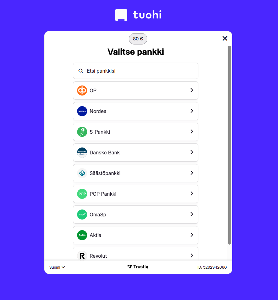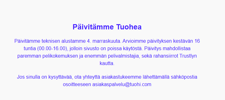 Tuohi Kasinon maksutapa muuttui Zimpleristä Trustlyyn 4.11.2025, eli nyt Trustly hoitaa rahaliikenteen yksinoikeudella molempiin suuntiin!