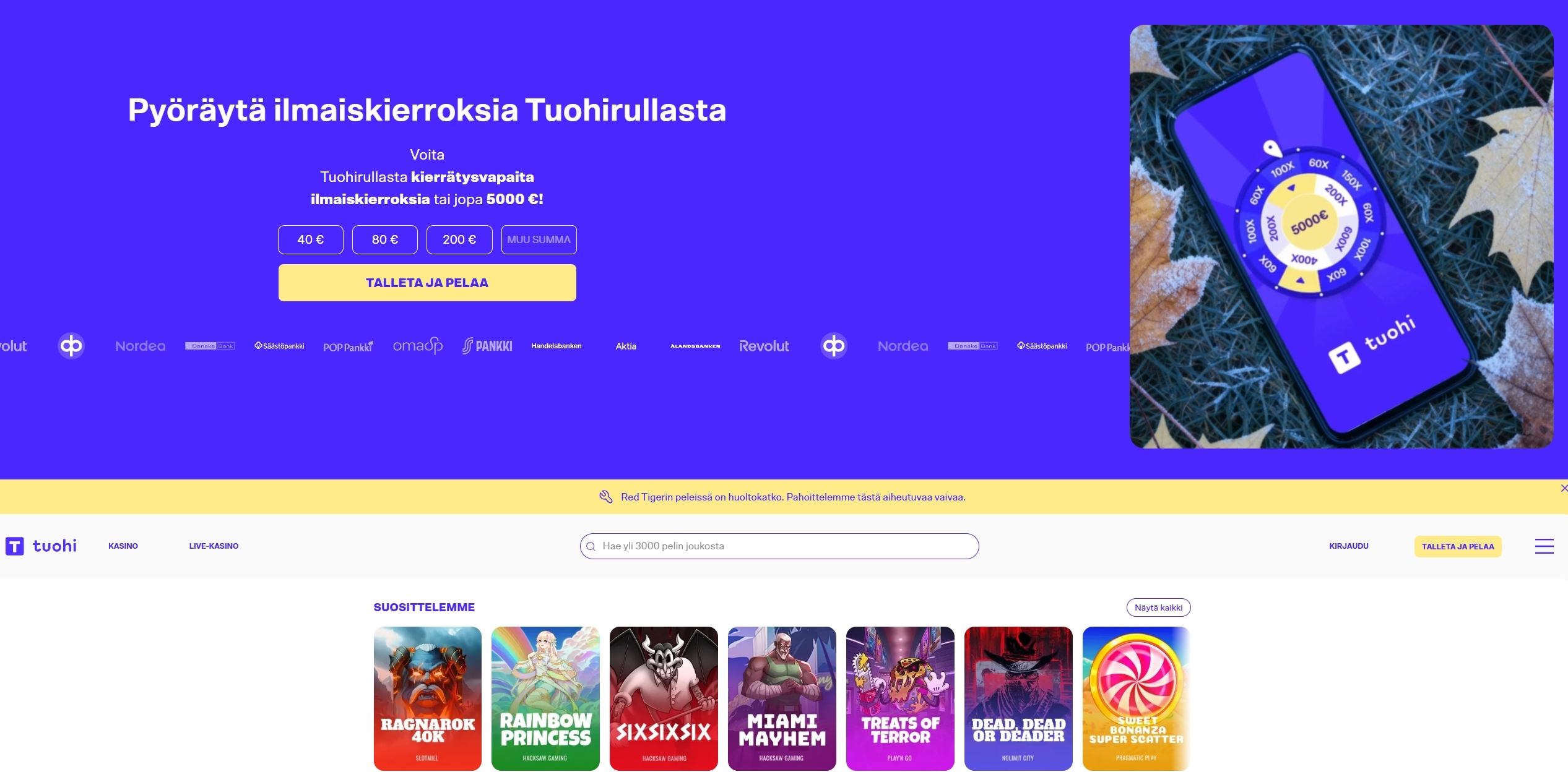Tuohi Kasino on raikkaan sinivalkoinen pikakasino, joka on rakennettu täysin suomalaisia pelaajia ajatellen. Kyseessä on nykyisin Trystly pikakasino ja minimitalletus on ainoastaan 1 euron. Jos kuitenkin teet vähän isomman talletuksen, pääset samalla pyöräyttämään täysin uniikkia Tuohirullaa! Jos onni oikein potkaisee Tuohirullan kanssa, ruudulle saattaa pärähtää jopa 600 käteiskierrosta tai huimat 5000 euroa silkkaa käteistä. Laadukas Suomi-optimointi on yksi sivuston ehdottomista vahvuuksista, mutta myös pelivalikoima ansaitsee kiitosta. Sivustolta löytyy yli 3000 peliä, joihin kuuluu muun muassa Hacksaw Gamingin uusimpia hittejä, Novomaticin legendaarisia klassikoita sekä Nolimit Cityn huippusuosittuja ostobonuspelejä. Mutta mitä muuta Tuohi Kasino tuo pöytään? Otimme kasinon tarkempaan syyniin heti sen auettua ja löysimme useita kiinnostavia ominaisuuksia. Lue alta Tuohi Kasino arvostelu ja katso miten se pärjäsi testissä!