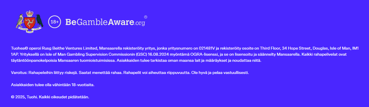 Vaikka lisenssi on täysin laillinen ja takaa kasinon turvallisuuden, tietosuojan ja reilut pelit, se ei tuo mukanaan ETA-lisenssin etuja. Koska Mansaari ei kuulu verovapaaseen ETA-alueeseen, kaikki Tuohi Casinolta saadut voitot ovat verollisia suomalaisille pelaajille.