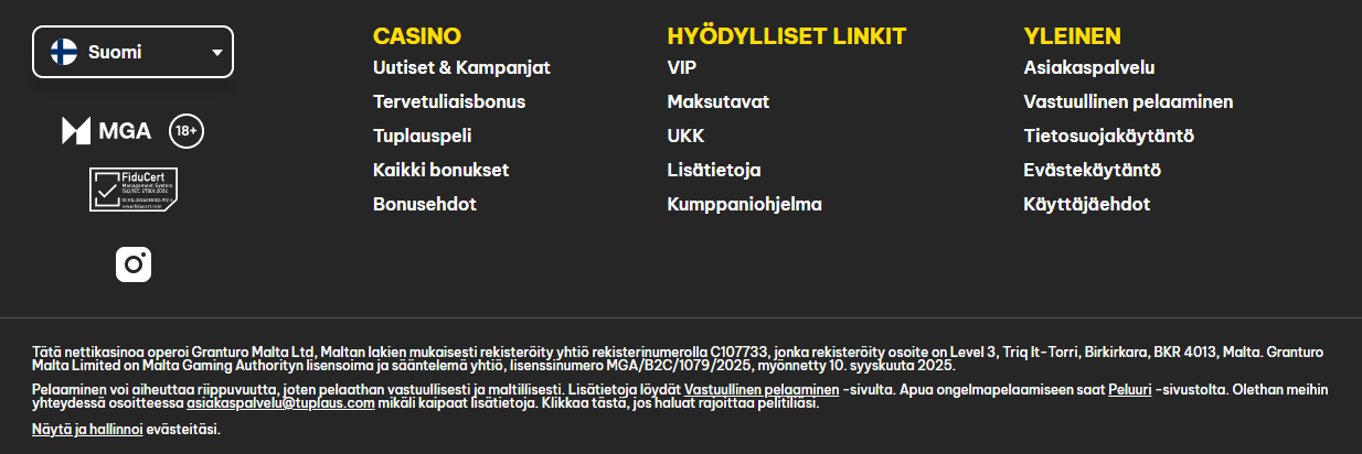 Lisäpisteitä Tuplaus saa MGA-lisenssistään, joka takaa verovapaat voitot, turvallisen toiminnan ja korkean luotettavuuden. Ei modernilta pikakasinolta oikein muuta voi edes toivoa!