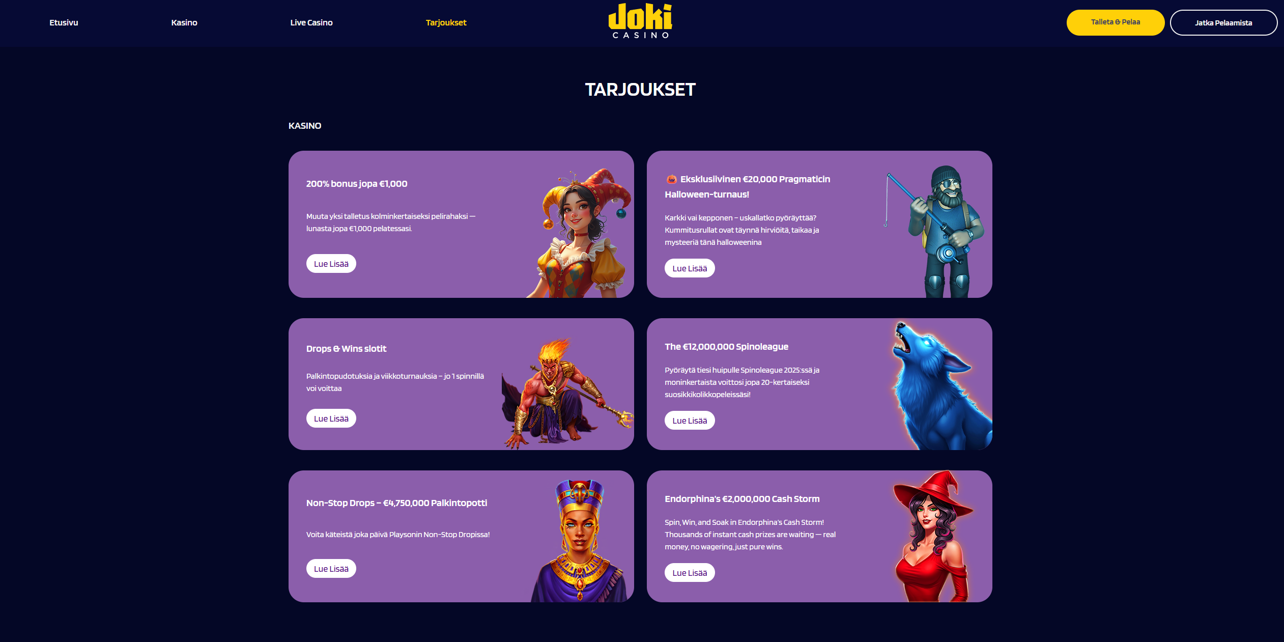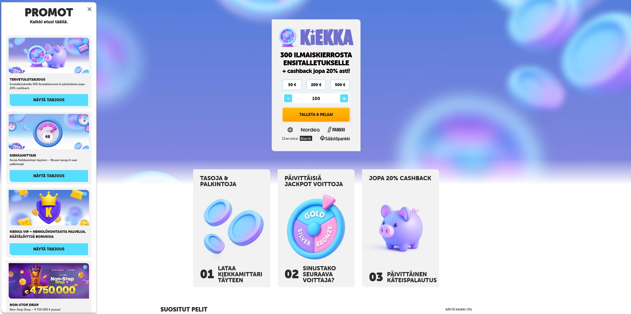 Kasinotarjoukset ovat loistava tapa suomalaisille pelaajille päästä kokeilemaan erilaisia kasinoita ja pelejä käytännössä ilman riskiä. Rekisteröimällä pelitilin ja lunastamalla esimerkiksi ilmaiskierroksia tai pienen määrän ilmaista pelirahaa pääsee nopeasti testaamaan, miten kasino ja sen pelivalikoima käytännössä toimivat. Etenkin ulkomaiset nettikasinot osaavat houkutella pelaajia isoilla bonuksilla ja lukuisilla ilmaiskierroksilla.