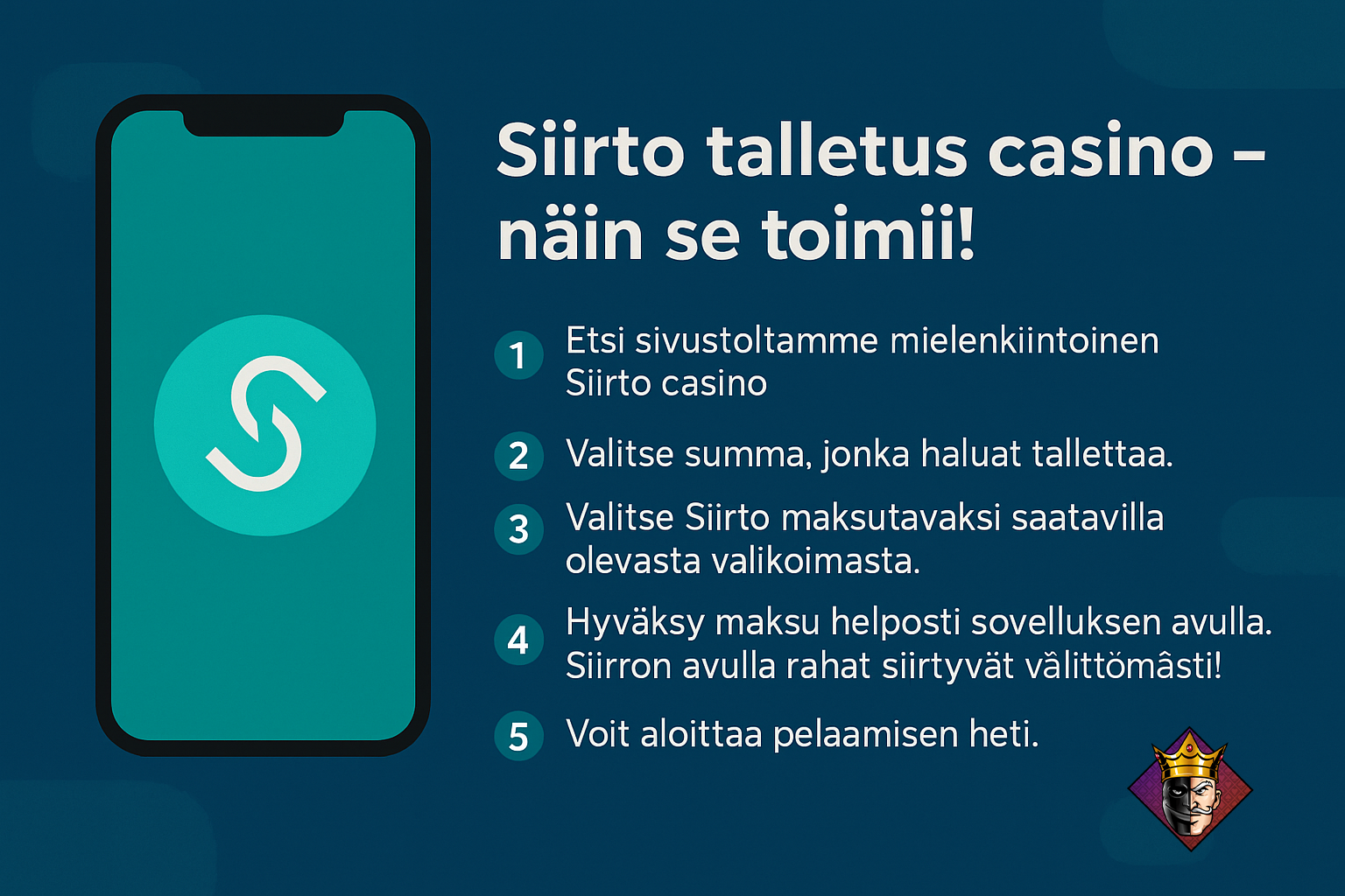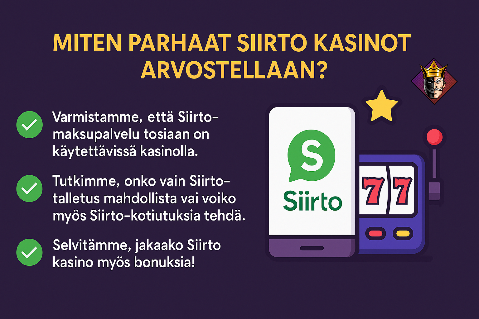 Tällä sivulla kerromme tarkemmin, miten Siirto-talletukset ja kotiutukset toimivat nettikasinoilla, miten turvallisesta maksutavasta on kyse, ja millaisia bonuksia uudet Siirto kasinot voisivat mahdollisesti tarjota pelaajille.