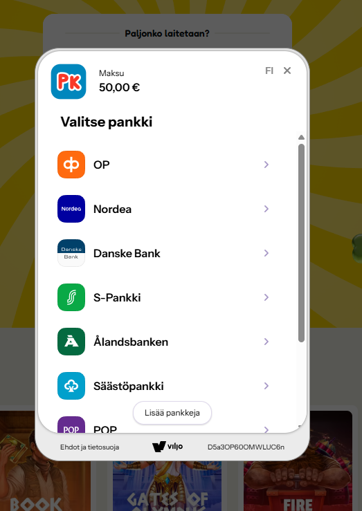 Viljo kasinoilla tunnistautuminen hoituu automaattisesti heti ensimmäisen verkkopankkitalletuksen yhteydessä. Kasino saa sinusta tarvittavat henkilötiedot suoraan pankiltasi, kun vahvistat maksun omilla verkkopankkitunnuksillasi.
